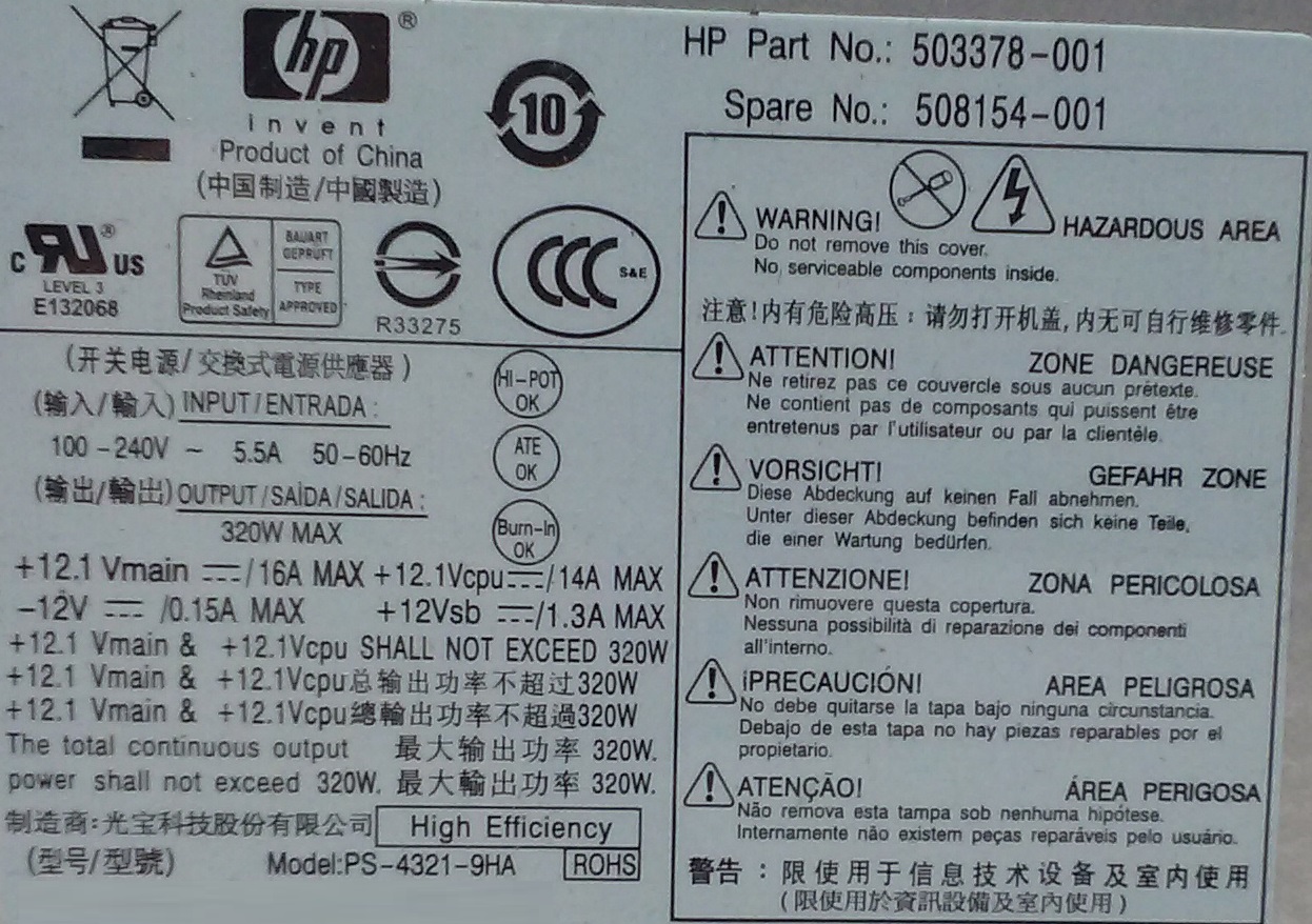 ALIMENTATION HP POUR elite 8000 8100 8200 8300 503378-001 320W