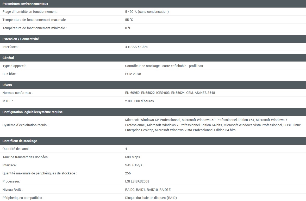 Contrôleur de stockage – 16 Canal – SATA-300 / SAS 2.0 faible encombrement – 600 Mo/s – RAID 0, 1, 10, 1E – PCI Express 2.0 x8